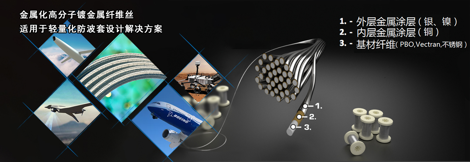 鍍金屬導(dǎo)電纖維絲是在高分子基材上雙層均勻涂鍍金屬,在航空航天線纜減重、機(jī)器人電纜屏蔽層、柔性天線、船舶拖曳電纜等減重和強(qiáng)度性能要求高的精密行業(yè)以更高的性能替代標(biāo)準(zhǔn)銅線,用作電纜、線束EMI屏蔽和專用導(dǎo)線。